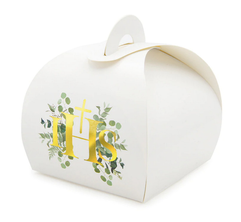 Eleganckie pudełeczka komunijne w klasycznym białym kolorze z efektownym złotym nadrukiem IHS oraz subtelnym motywem gałązek eukaliptusa to idealne rozwiązanie na podziękowania dla gości podczas Pierwszej Komunii Świętej.
