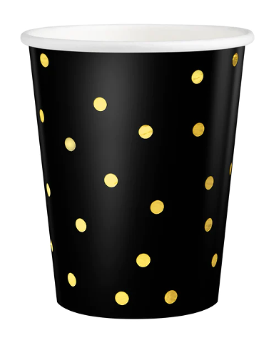 KOMPLET 6 szt. Papierowych jednorazowych czarnych kubków, w ZŁOTE KROPKI