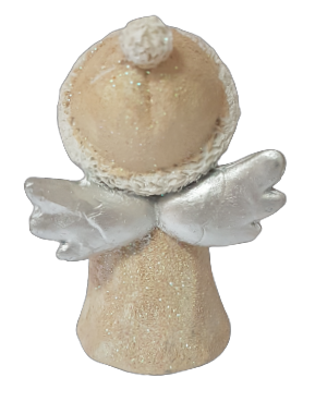 Figurka stojące aniołka w zimowym biało kremowym z drobinkami brokatu stroju trzymającego srebrną gwiazdkę w rękach.