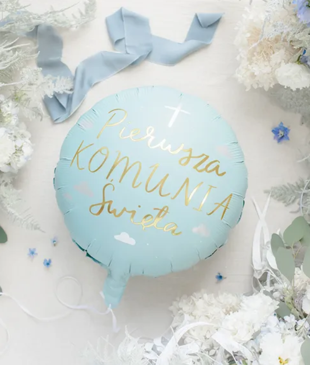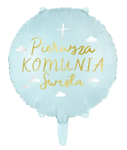 BALON FOLIOWY okrągły BŁĘKITNY, z złotym napisem PIERWSZA KOMUNIA ŚWIĘTA.