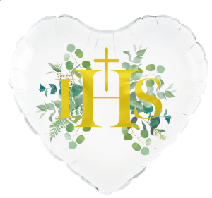 BALON FOLIOWY biały w kształcie serca, z napisem IHS, oraz motywem eukaliptusa