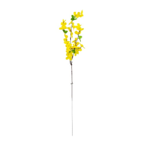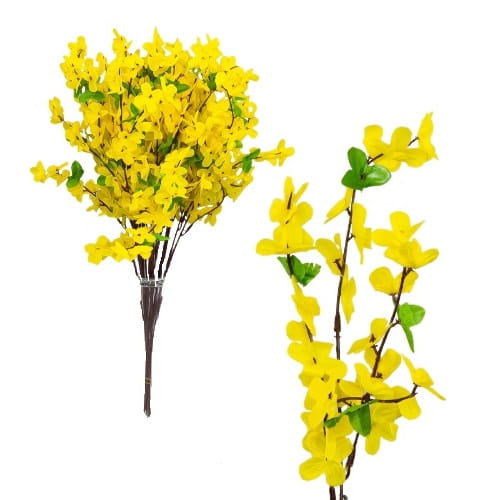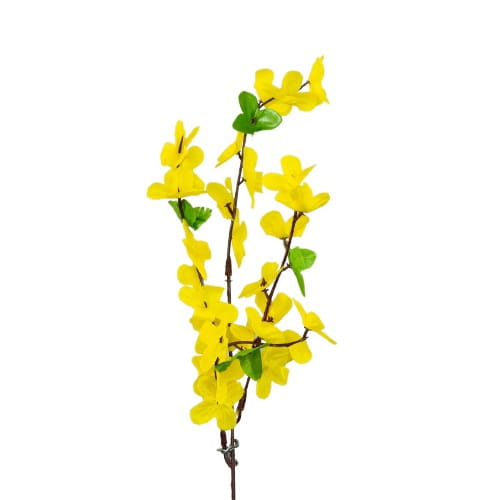 Sztuczna gałązka forsycji w żółtym kolorze z zielonymi listkami.
