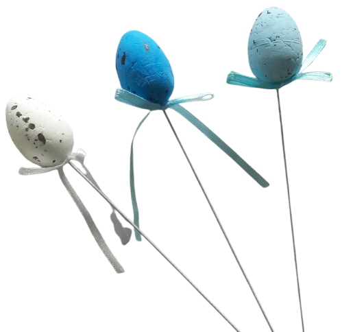 Jajka BIAŁE NIEBIESKIE 3 szt 4 cm na piku wielkanocne jajko w czarne plamki ze wstążką