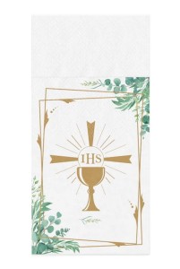 BIAŁE KIESZONKI (serwetki) na sztućce, z złotym kielichem IHS oraz z akcentem eukaliptusa