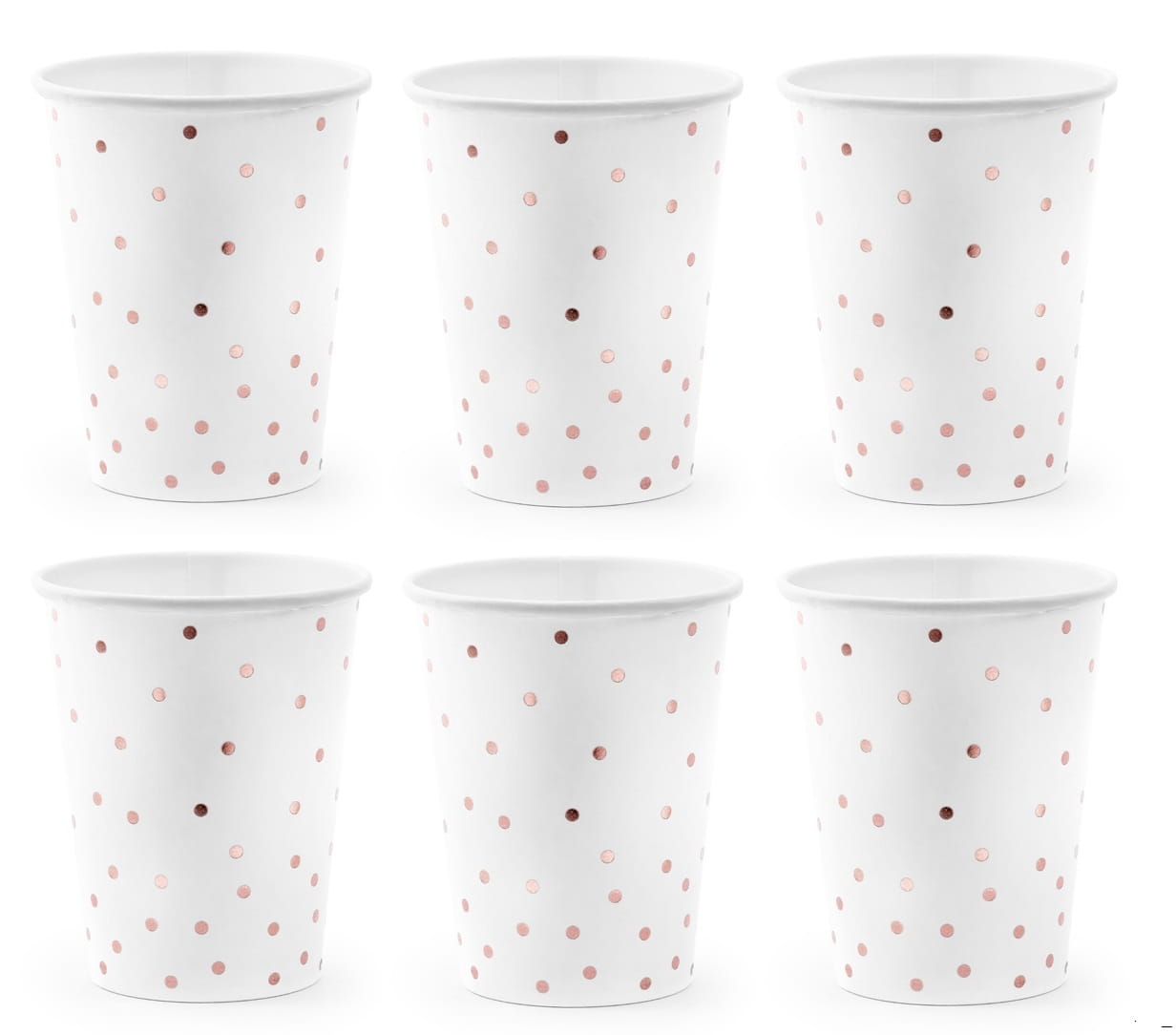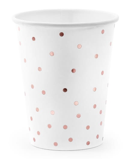 KOMPLET 6 szt. papierowych jednorazowych BIAŁYCH kubków, w kropki ROSE GOLD.