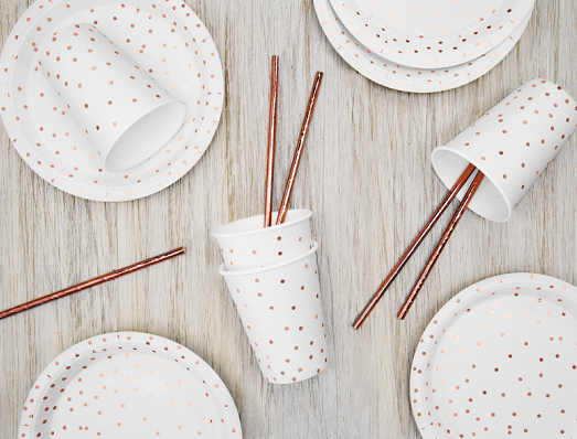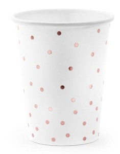 KUBKI jednorazowe BIAŁE W ROSE GOLD KROPKI 6szt Kubeczki papierowe urodzinowe, imprezowe, baby shower, komunia, wesele, ślub, wieczór panieński