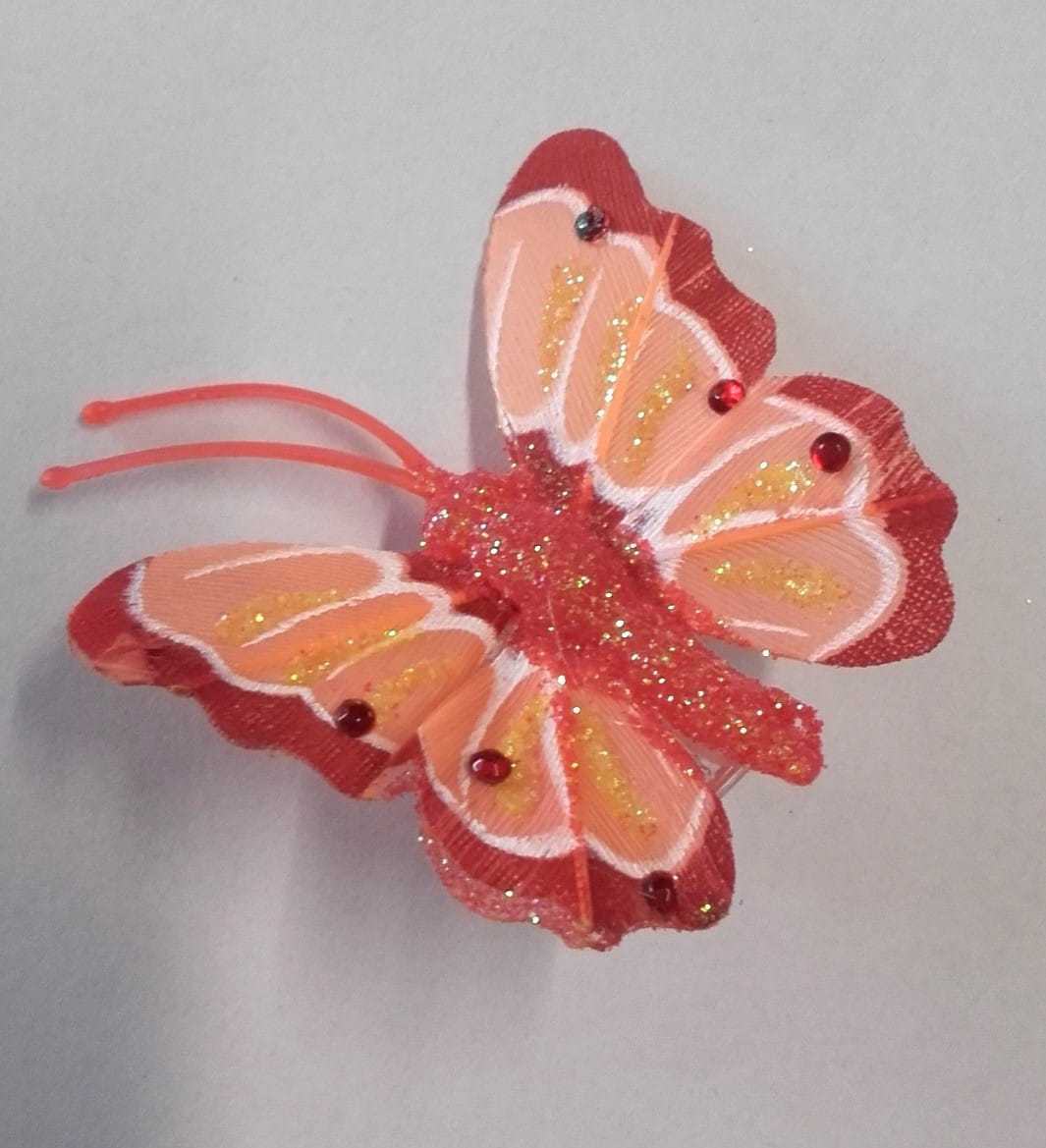 MOTYL na klipsie - CZERWONY, zdobiony brokatem i cyrkniami
