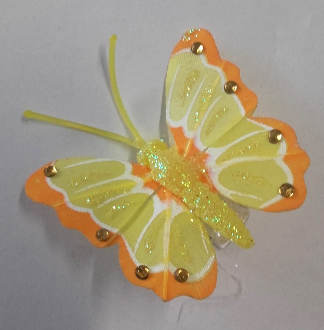 MOTYL na klipsie - ŻÓŁTY, zdobiony brokatem i cyrkniami