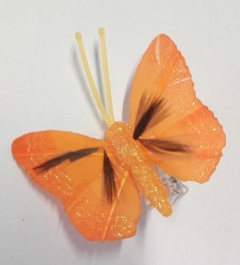 MOTYL na klipsie - ŻYWY POMARAŃCZ, zdobiony brokatem i piórkami