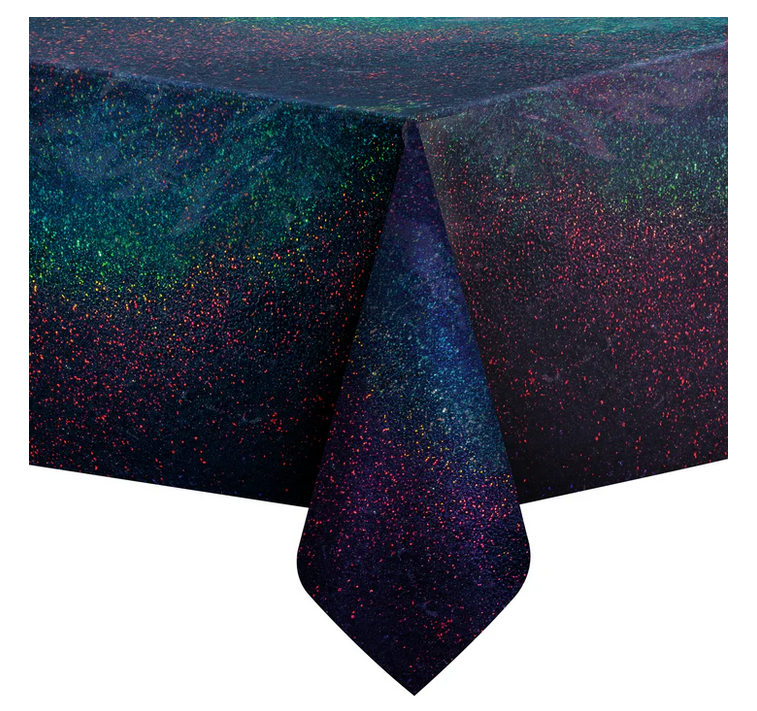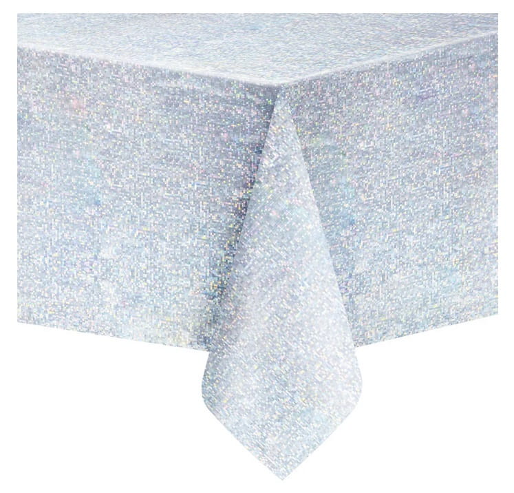 Foliowy obrus HOLOGRAFICZNY w srebrnym kolorze, z drugiej strony czarny holograficzny.