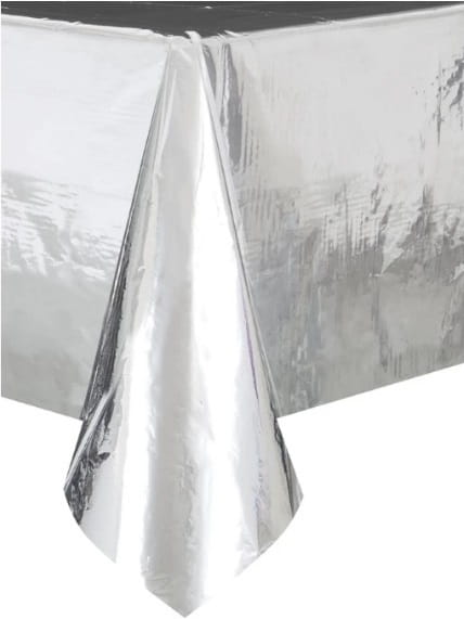 Foliowy obrus metalizowany, błyszczący w srebrnym kolorze.