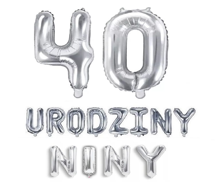 SREBRNY NAPIS 40 URODZINY z balonów + IMIĘ 4 LITERY, cyfry 40 100cm, napis 35cm; srebrne balony na 40 urodziny, 40-nastkę
