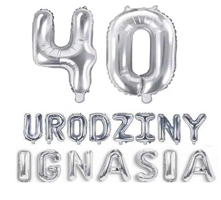 SREBRNY NAPIS 40 URODZINY z balonów + IMIĘ 7 LITER, cyfry 40 100cm, napis 35cm; srebrne balony na 40 urodziny, 40-nastkę