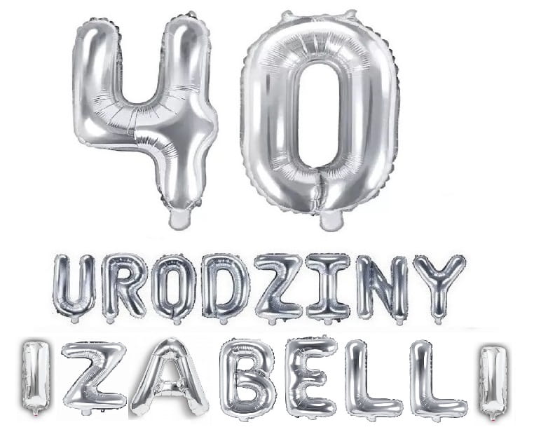 SREBRNY NAPIS 40 URODZINY z balonów + IMIĘ 8 LITER, cyfry 40 100cm, napis 35cm; srebrny balony na 40 urodziny, 40-nastkę
