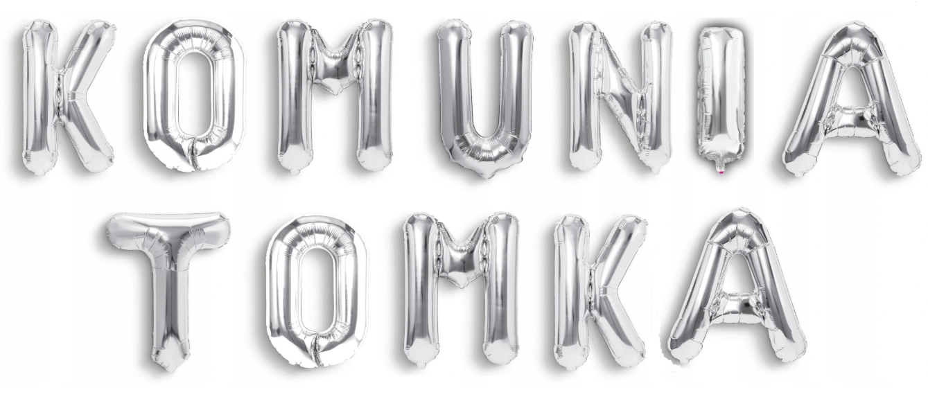 Napis KOMUNIA + IMIĘ DZIECKA (5 liter) z balonów foliowych w kolorze SREBRNYM: