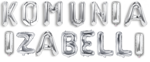 Napis KOMUNIA + IMIĘ DZIECKA (8 liter) z balonów foliowych w kolorze SREBRNYM: