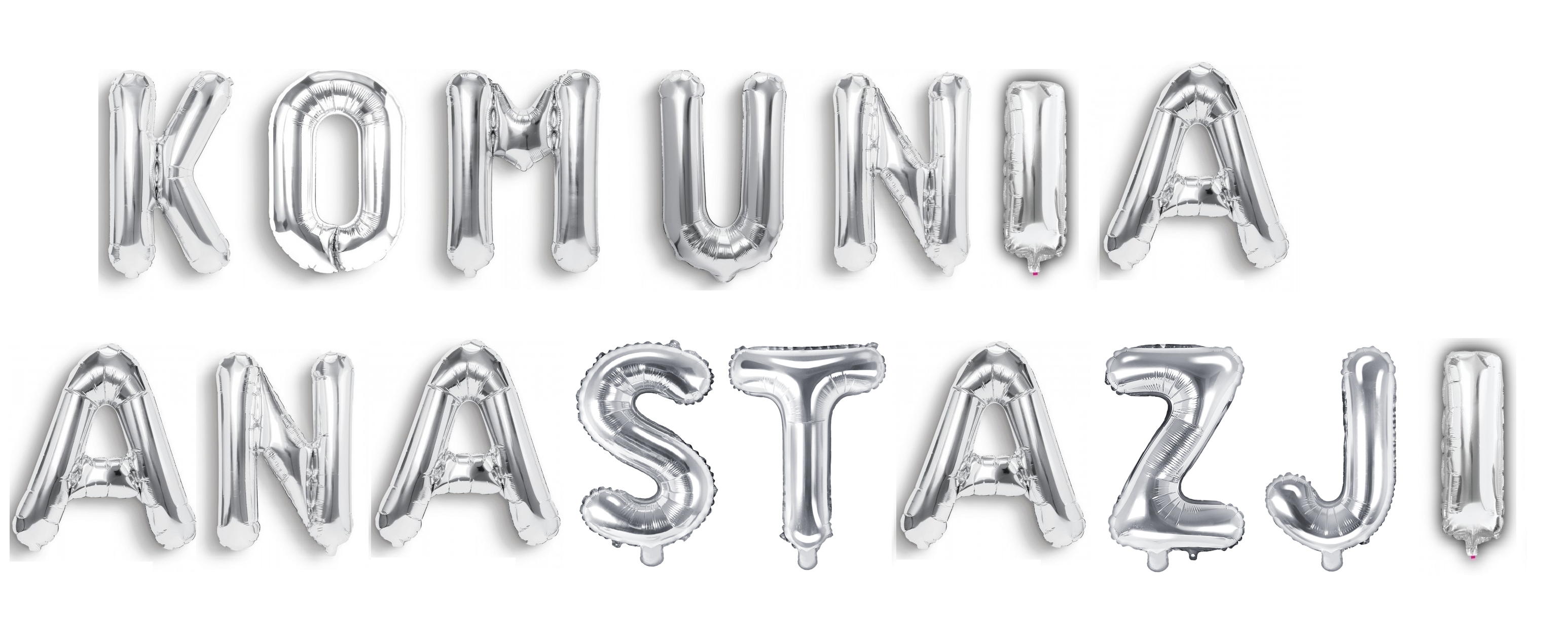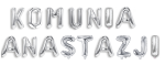 Napis KOMUNIA + IMIĘ DZIECKA (9 liter) z balonów foliowych w kolorze SREBRNYM: