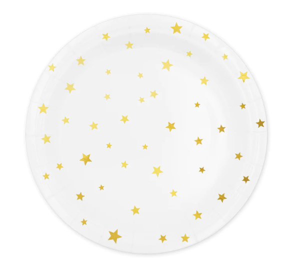 TALERZ BIAŁY OKRĄGŁY w ZŁOTE GWIAZDKI, talerzyki 18cm 6szt Talerze urodzinowe, imprezowe