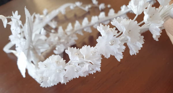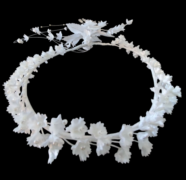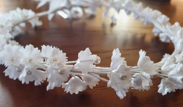 Delikatny i elegancki, ręcznie wykonany wianek komunijny z materiałowych (satynowych), białych kwiatuszków przypominających konwalię.