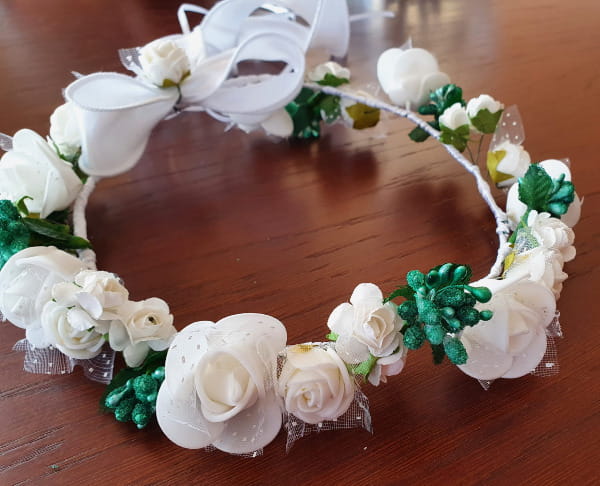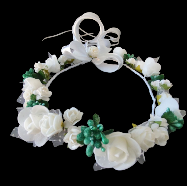 Ręcznie wykonany wianek z białych piankowych i papierowych różyczek z zielonymi listkami, przeplatanych białymi różyczkami z tiulem oraz zielonymi pręcikami.