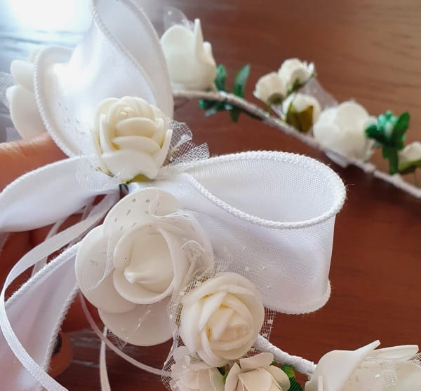 Zakończony satynową, białą kokardą z białą różyczką z tiulem oraz ze spuszczonymi w dół białymi wstążkami i 2 wstążkowymi zwisami.