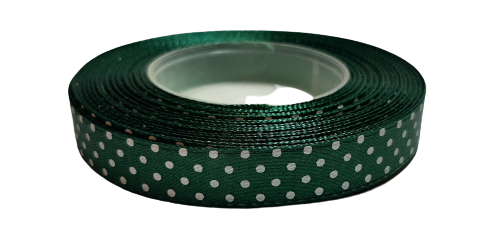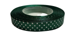 WSTĄŻKA SATYNOWA AKSA 12mm BUTELKOWA ZIELEŃ 6090 w białe kropki 22m