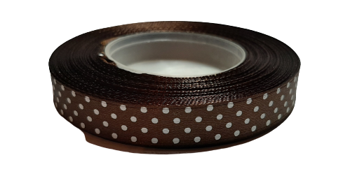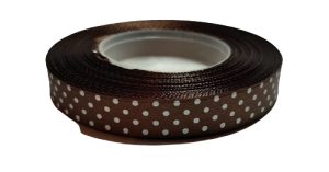 WSTĄŻKA SATYNOWA AKSA 12mm CIEMNY BRĄZ 6135 w białe kropki 22m