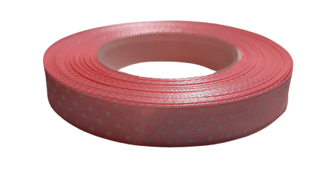 WSTĄŻKA SATYNOWA AKSA 12mm JASNORÓŻOWA 6037 w białe kropki 22m