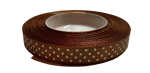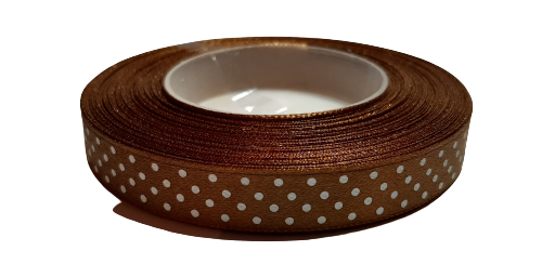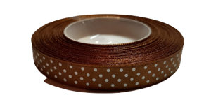WSTĄŻKA SATYNOWA AKSA 12mm JASNY BRĄZ 6132 w białe kropki 22m