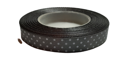 WSTĄŻKA SATYNOWA AKSA 12mm STALOWA 6140 w białe kropki 22m