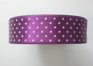 WSTĄŻKA SATYNOWA AKSA 25mm CIEMNOFIOLETOWA, CIEMNY FIOLET 6123 w białe kropki 22m Tasiemka w groszki