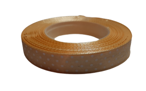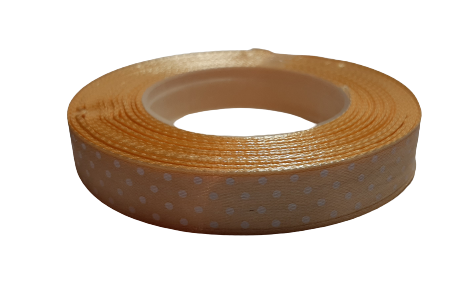 Wstążka satynowa 12mm BRZOSKWINIOWA w białe kropki 22m Tasiemka Aksa 6007