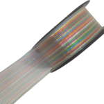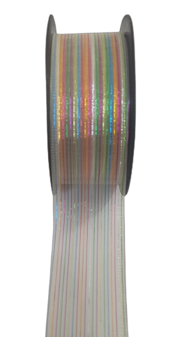 Dekoracyjna biała tasiemka z drutem oraz kolorowymi, metalizowanymi nitkami ułożonymi w pasy.