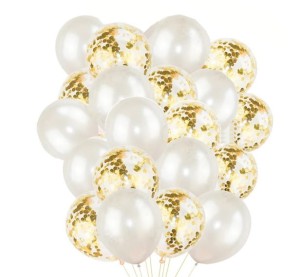 ZESTAW 20szt BALONÓW 10x balony BIAŁE, PERŁOWE metalizowane, 10x balony przezroczyste ze ZŁOTYM KONFETTI