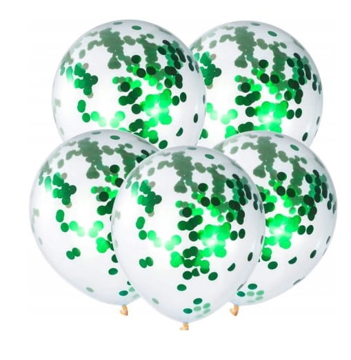- 5szt. BALONÓW PRZEŹROCZYSTYCH Z ZIELONYM (CIEMNOZIELONYM) KONFETTI