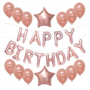 ZESTAW BALONÓW Urodzinowych w kolorze ROSE GOLD Napis z balonów HAPPY BIRTHDAY, balony gwiazdki, balony lateksowe 27elem. ZU6