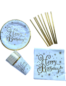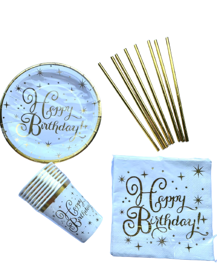 ZESTAW BIAŁO-ZŁOTY Talerzyki Słomki Kubki Serwetki HAPPY BIRTHDAY na urodziny dla 8 osób