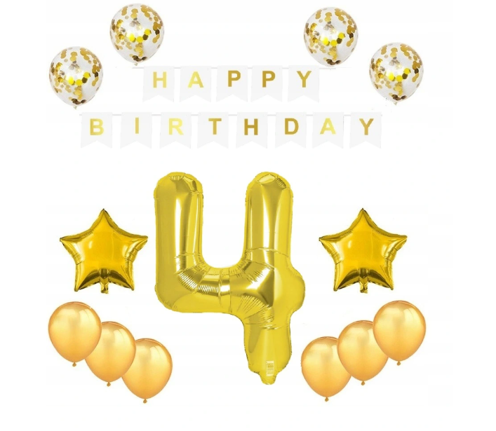 ZESTAW DEKORACJI na 4 latka Urodziny, Biały baner, złote balony, balony gwiazdki, złoty balon cyfra 4, balony ze złotym konfetti