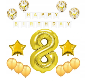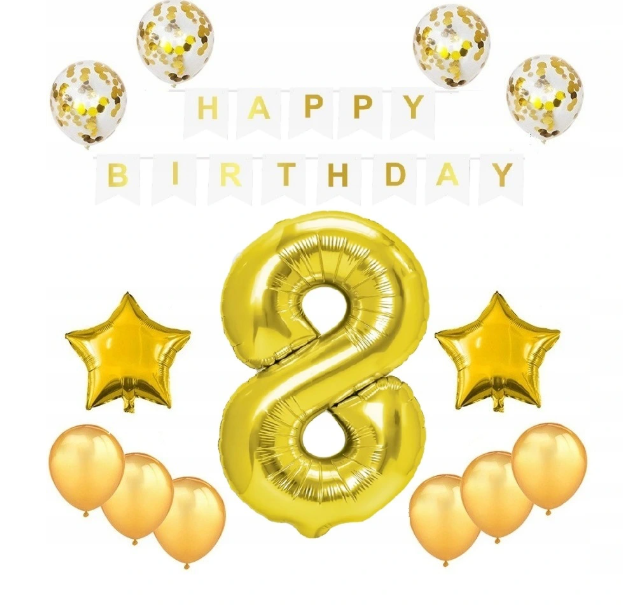 ZESTAW DEKORACJI na 8 lat Urodziny, Biały baner, złote balony, balony gwiazdki, złoty balon cyfra 8, balony ze złotym konfetti