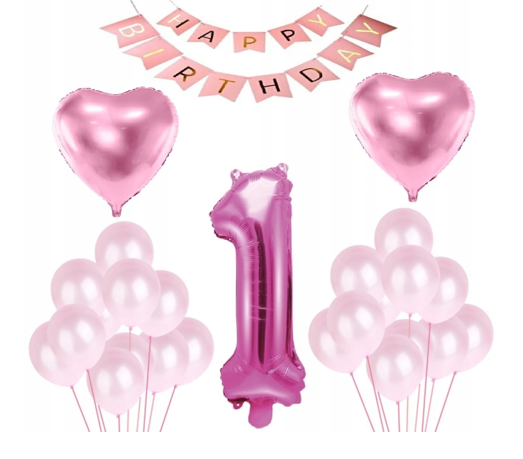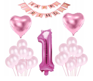 ZESTAW BALONÓW NA 1 URODZINY W KOLORZE RÓŻOWYM, dla dziewczynki: