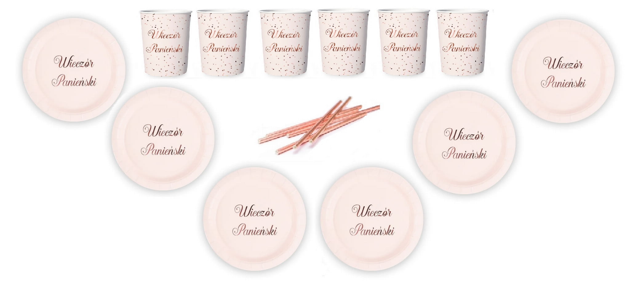 Talerzyki oraz kubki posiadają nadruk "Wieczór Panieński" w rose gold kolorze, który jest metalizowany czyli mieni się delikatnie w świetle.