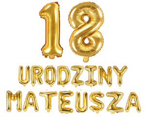 Cyfry 18 + napis URODZINY + IMIĘ 8 LITER z balonów foliowych w kolorze ZŁOTYM: