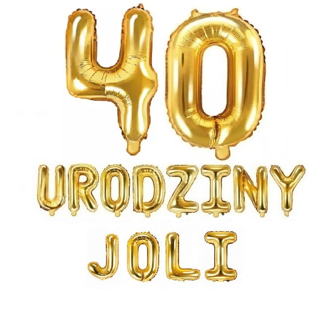 ZŁOTY NAPIS 40 URODZINY z balonów + IMIĘ 4 LITERY, cyfry 40 100cm, napis 35cm; balony na 40 urodziny, 40-nastkę