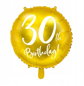 Balon foliowy metalizowany, okrągły w kolorze złotym z białym napisem: 30th Birthday
