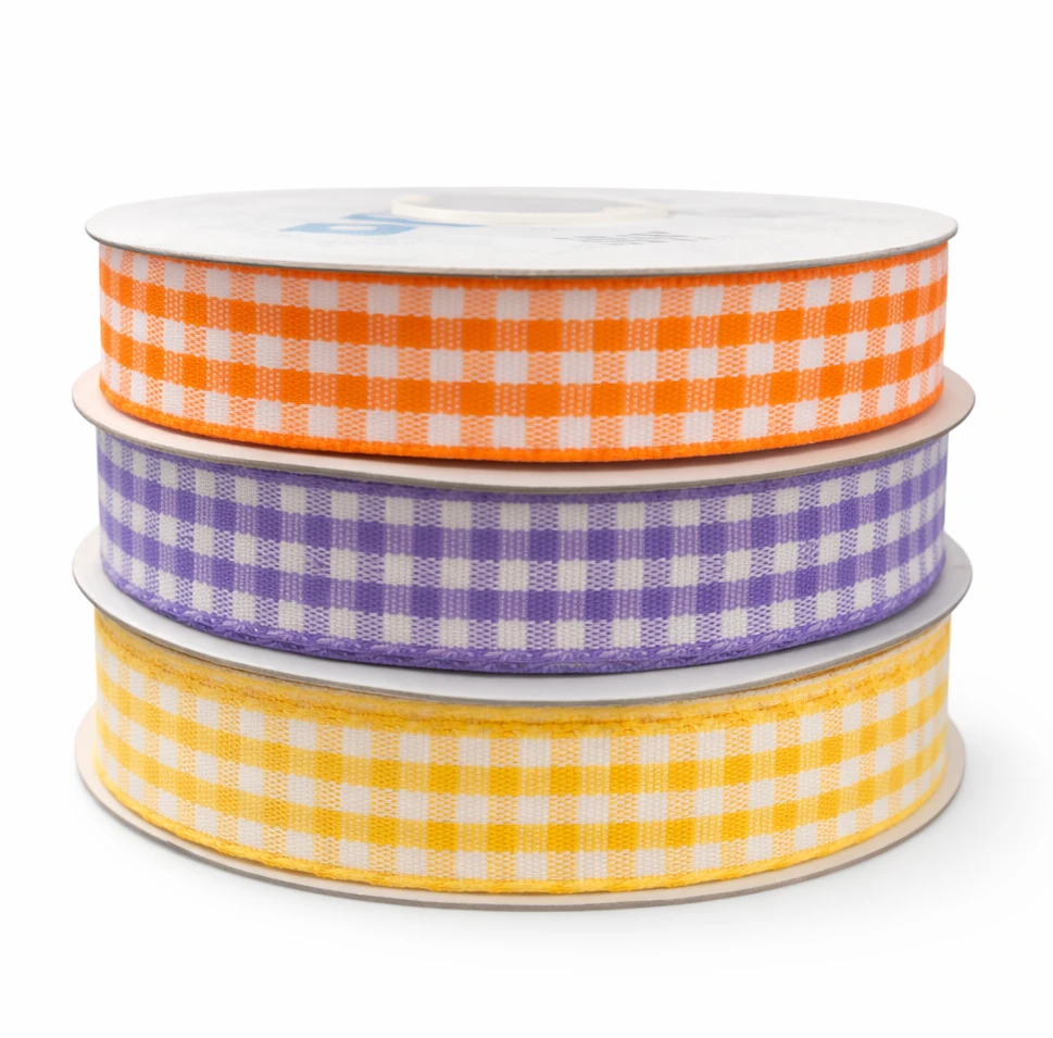 Stylowy i estetyczny zestaw czterech wstążek w klasyczną kratkę (gingham) w modnych kolorach: pomarańczowym, fioletowym i żółtym. Idealne do dekoracji, pakowania prezentów, DIY, florystyki oraz ozdób okolicznościowych.