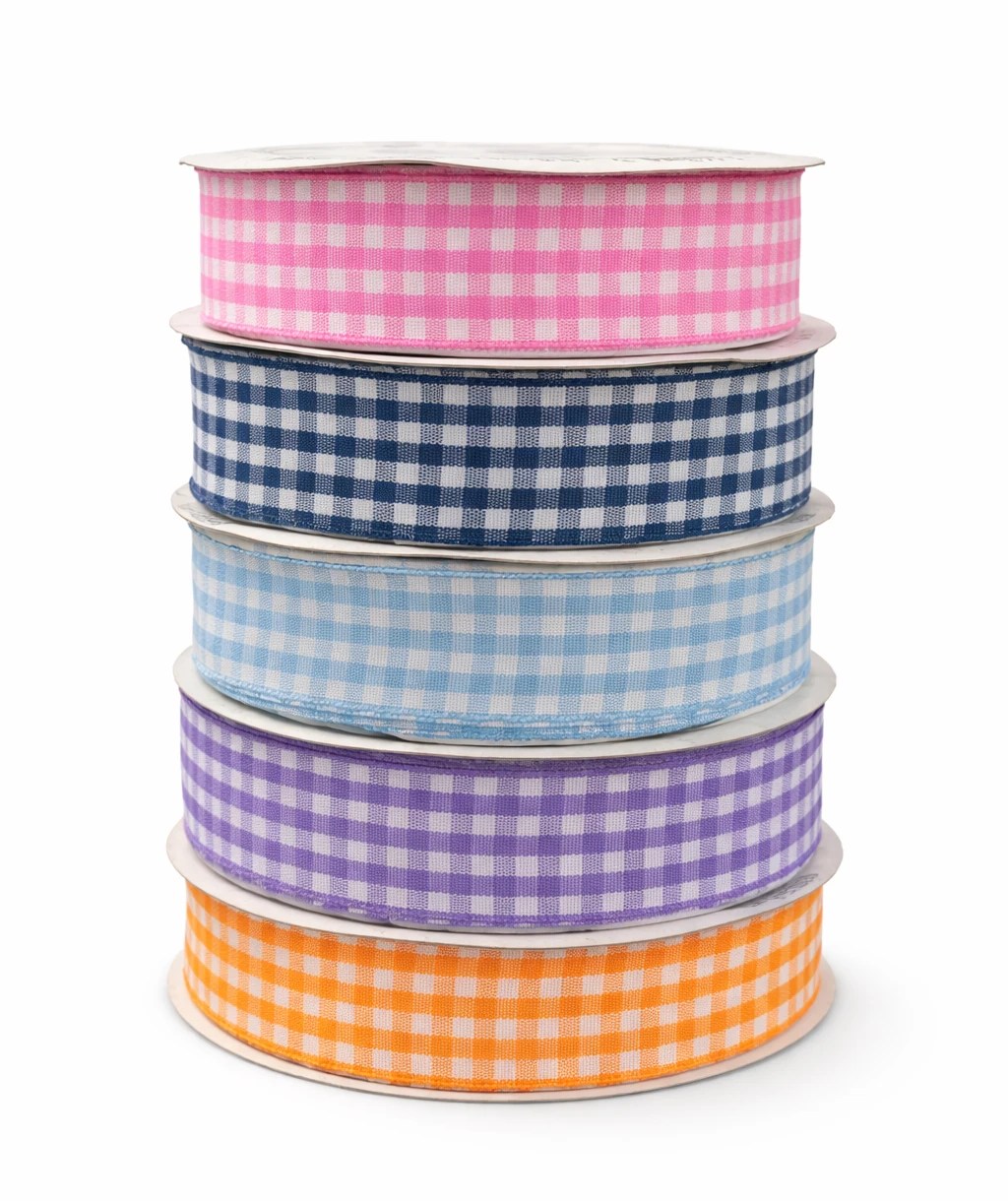 Stylowy i estetyczny zestaw pięciu wstążek w klasyczną kratkę (gingham) w modnych kolorach: pomarańczowym, fioletowym, niebieskim, granatowym i różowym. Idealne do dekoracji, pakowania prezentów, DIY, florystyki oraz ozdób okolicznościowych.