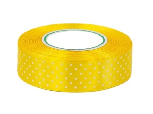 Wstążka satynowa żółta w białe kropki 25 mm 22 m Tasiemka w kropeczki małe grochy groszki na rolce
